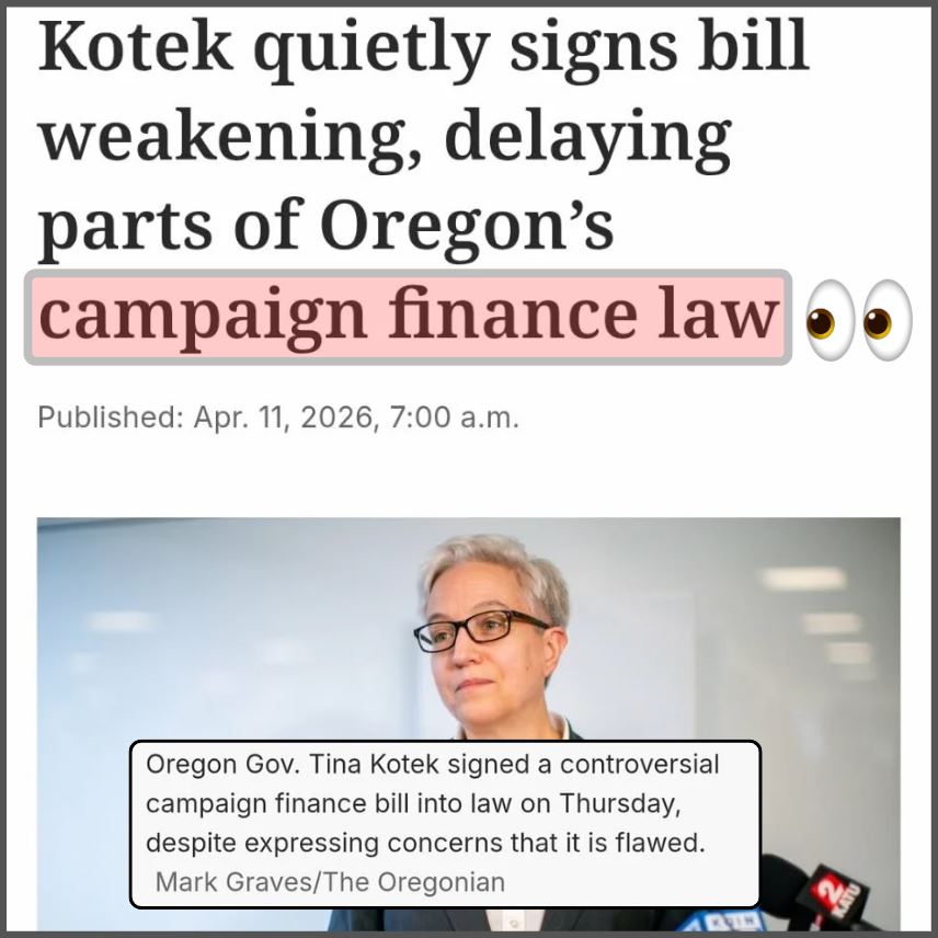 Now, in the latest Oregon Live report article titled, “Kotek quietly signs bill weakening, delaying parts of Oregon’s campaign finance law”, they say that, “Political donors will be allowed to spend more money on Oregon elections, with less transparency, under a bill that Gov. Tina Kotek signed into law Thursday.” (04-09-26)